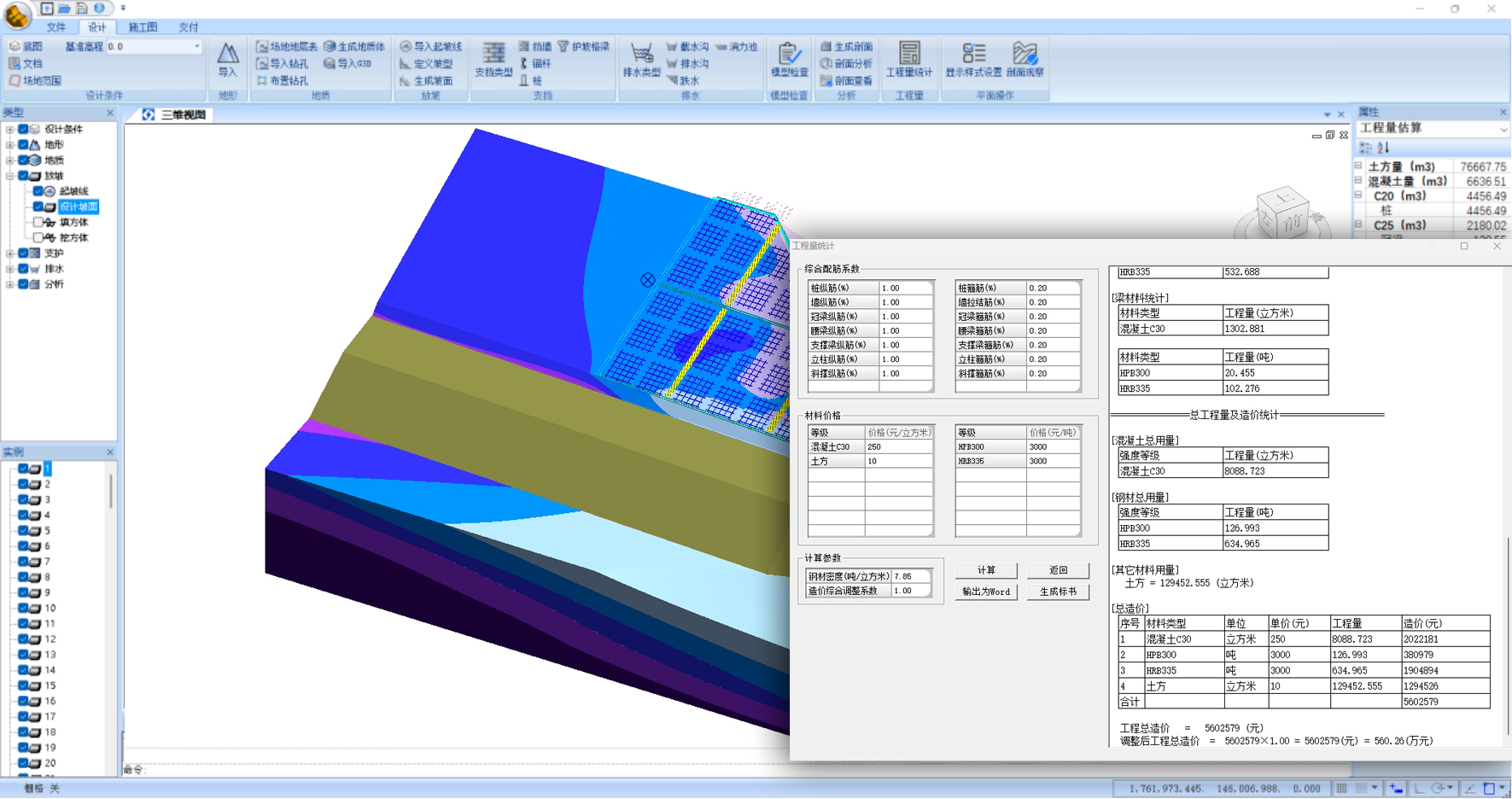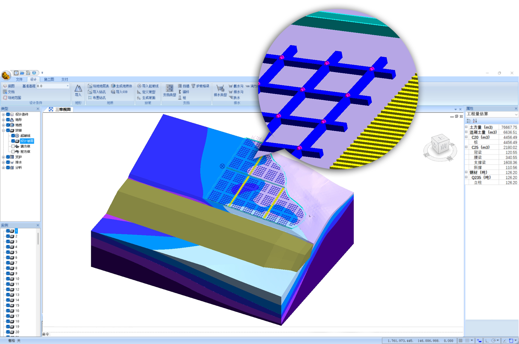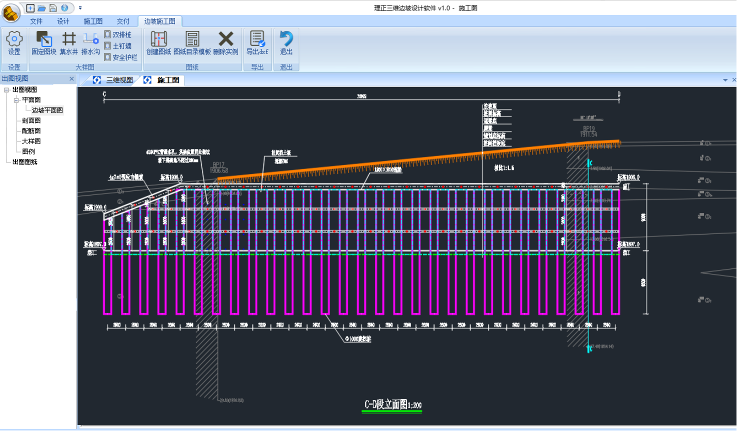 软件能够无缝对接建模数据及分析结果自动生成边坡施工图并统计工程量,边坡施工图涵盖了出图设置、平面图、立面图、剖面图、配筋图、大样图等多个关键要素,同时还配备了丰富的大样图库,确保用户能够高效、准确地完成施工图的设计。