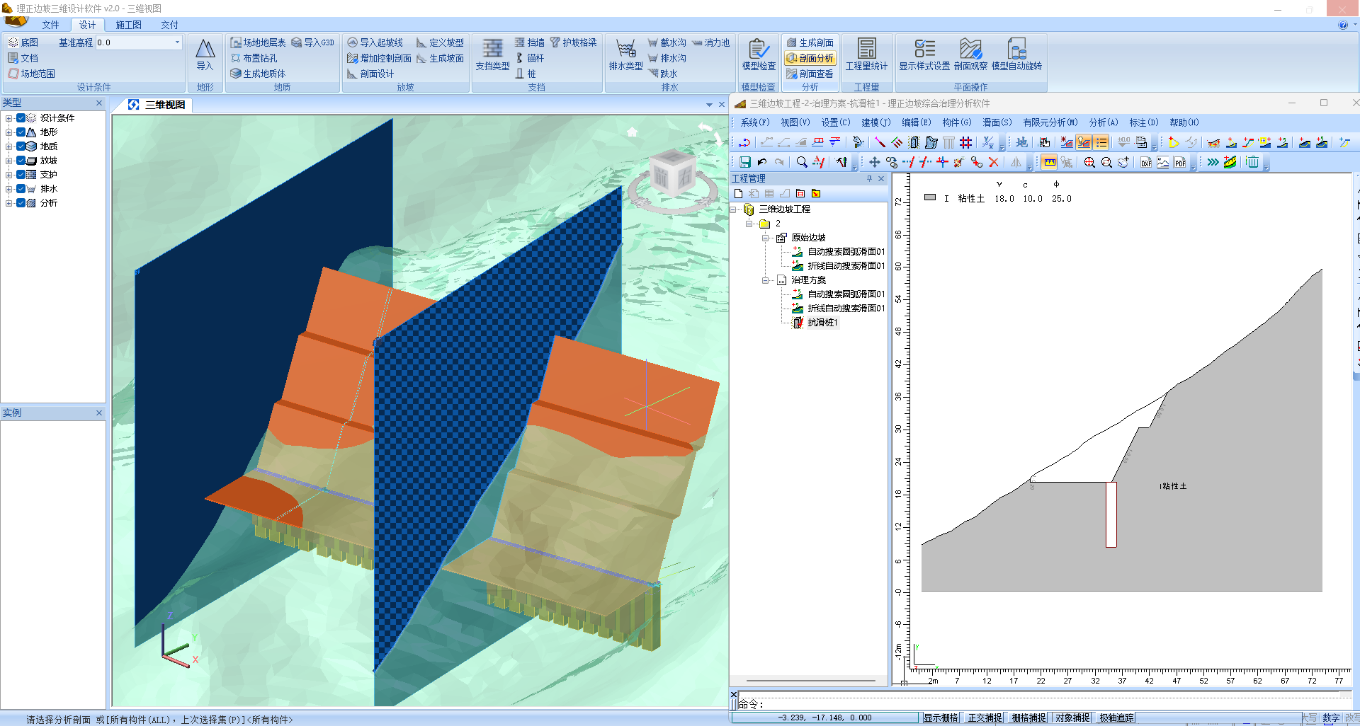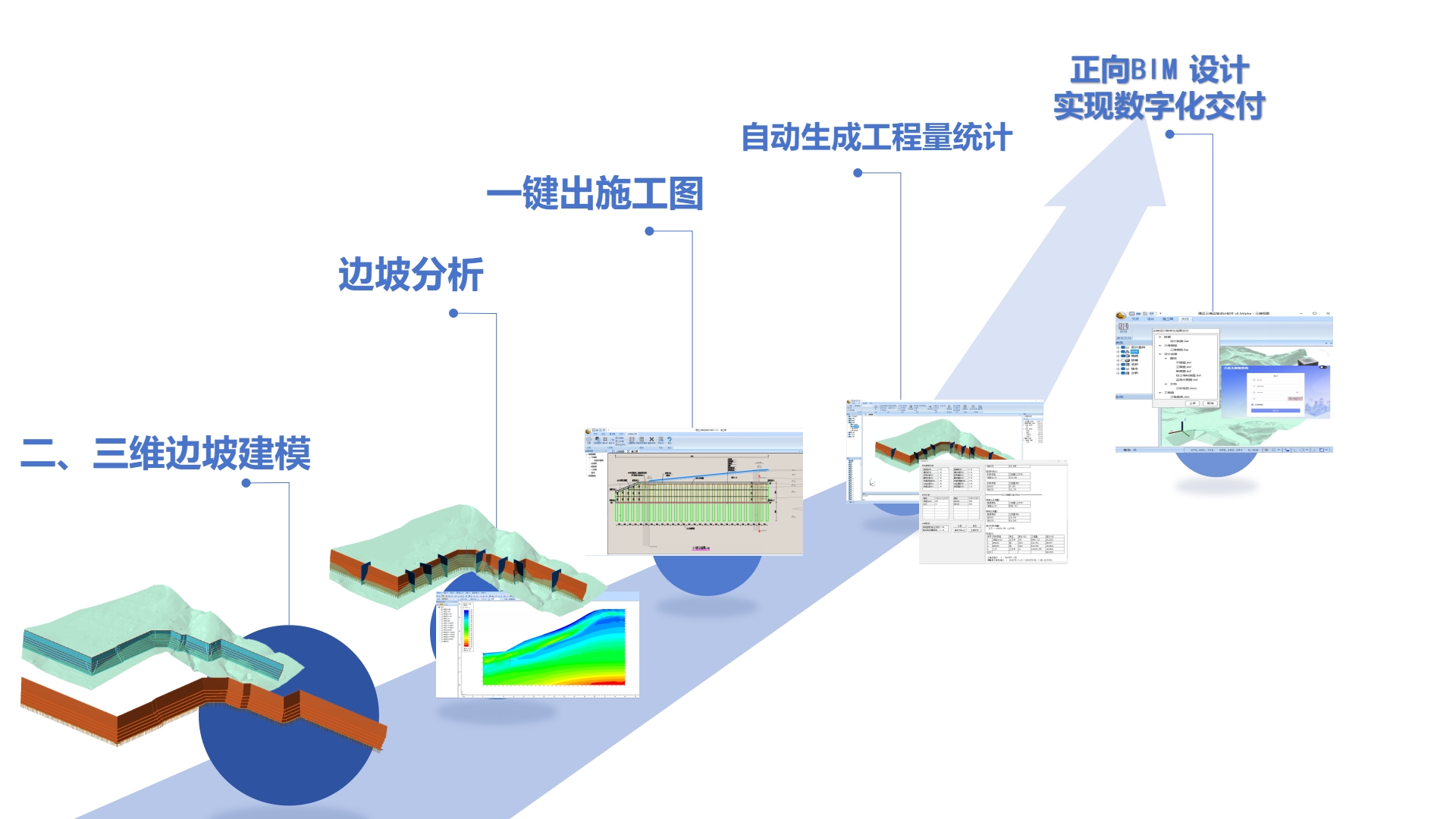 理正边坡三维设计软件是集三维地质、边坡设计、边坡分析、施工图、数字化交付于一体的设计软件,采用理正自主研发的国产图形平台,可以实现二、三维联动,以三维地质模型为基础,在三维空间上实现放坡、支护、排水等边坡全要素设计,边坡剖面可送入理正边坡综合治理分析软件进行边坡稳定性分析,可自动生成边坡施工图并进行工程量统计,设计成果支持数字化交付。