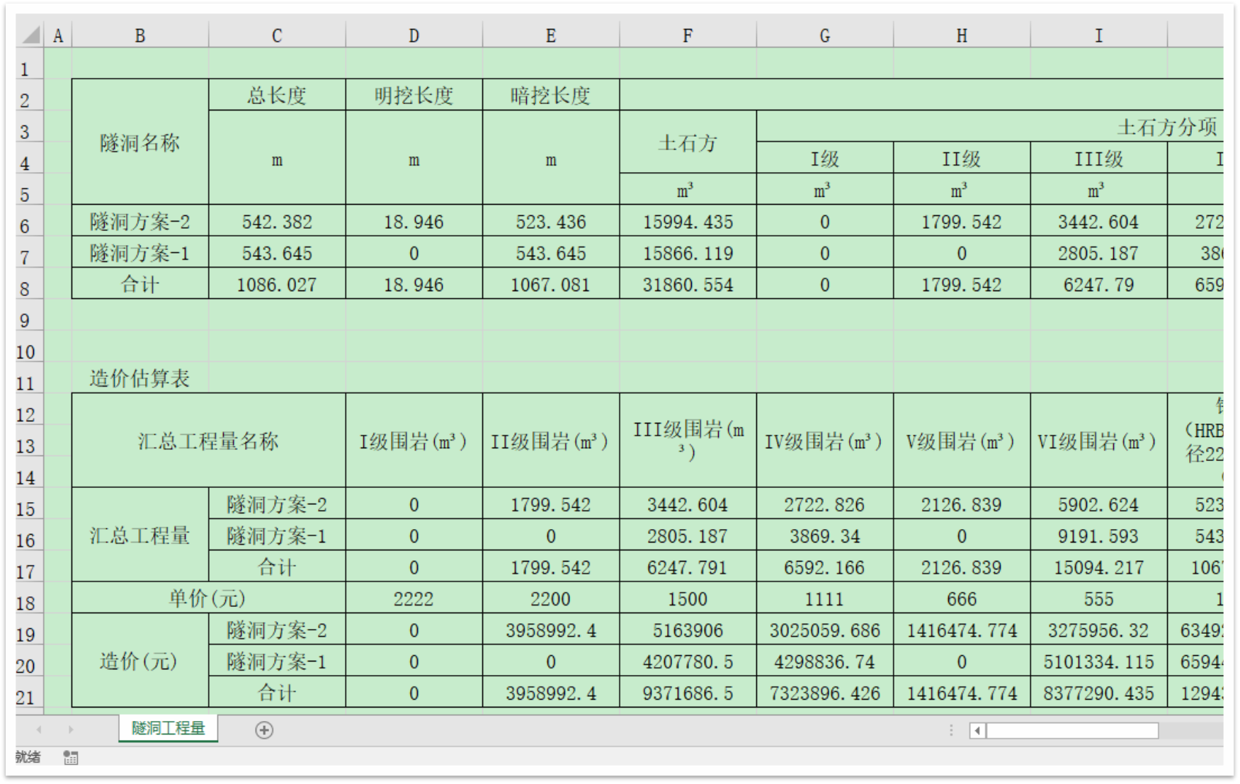 可自动计算分级围岩长度、深浅埋长度等关键指标,快速统计明挖、暗挖长度及分级围岩开挖量与支护构件工程量,并支持造价估算。软件基于初期支护标准断面,精准输出工程量统计表,助力方案比选与决策。