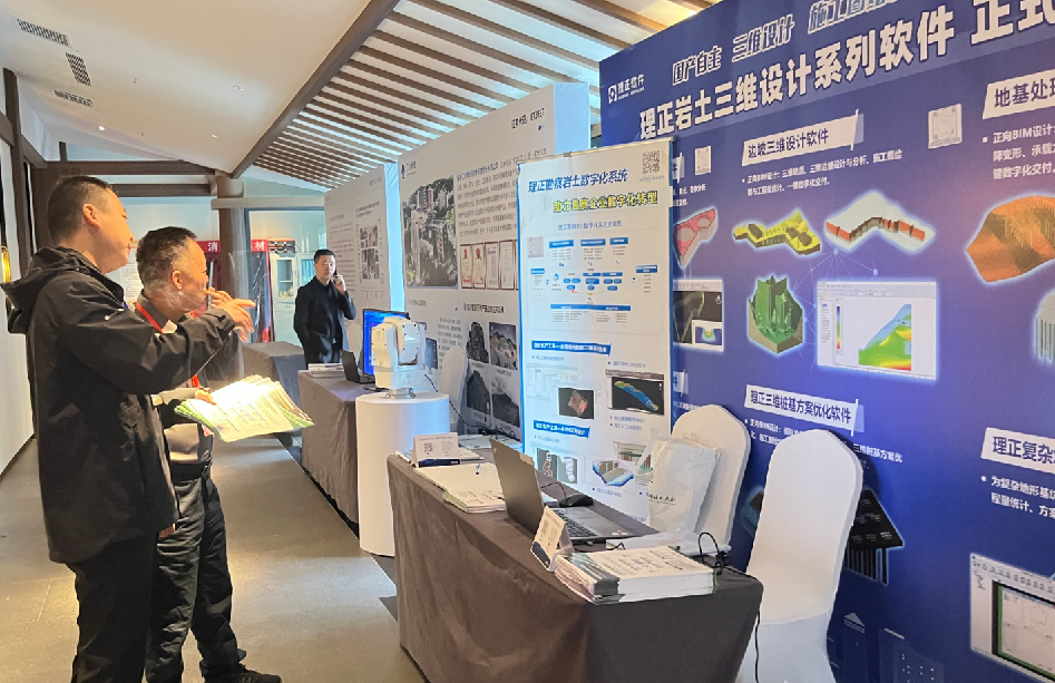 在会议期间,北京理正亮相了多款岩土三维设计专业应用软件以及数字化系统,如理正勘察岩土数字化系统、理正深基坑支护三维设计软件、理正边坡三维设计软件、理正地基处理三维设计软件、理正复杂填挖三维设计软件、理正三维桩基方案优化软件、理正隧洞三维方案设计软件等。作为本次会议受邀的岩土工程行业数字化专业化应用服务厂商,理正软件的展台现场也迎来了众多设计企业与生态合作伙伴的关注与探讨。