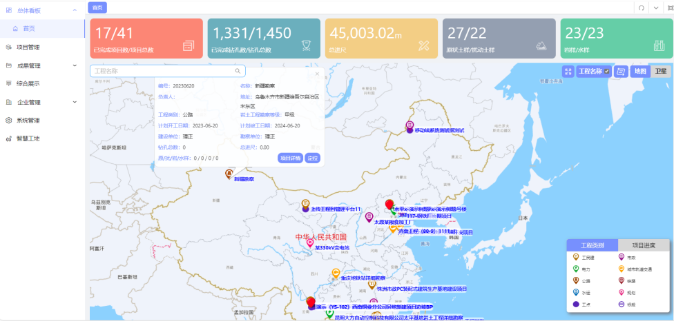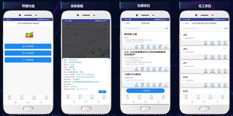 在手机端,本系统提供总体看板、项目管理和成果管理功能。企业管理者可直接在移动端对企业所有的工程进行整体查看,可进行在建工程的进度浏览、任务分配,对完工项目可直接查看相关数据资料、图件文档等信息。在网页端,系统同样提供丰富的数据查看窗口以及单工程、多工程的数据统计功能。满足企业管理者对企业项目的全局把控。同时CIM综合展示系统可满足企业管理者在网页端对勘察专业、设计专业、测绘专业等多个专业的数据成果三维可视化浏览。