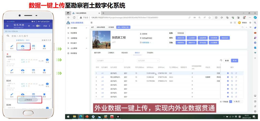 本系统助力勘察工程师从前期准备到勘察外业、室内试验以及内业整理全流程的数字化作业,利用数字化手段,通过用户登录权限,实现企业历史数据的复用、外业数据的任务派发和信息化采集、内业端数据的共享、三维快速建模工具以及最终成果的数字化交付。